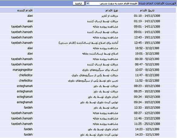 همهی اقدامهایی را که دربارهی مقاله انجام شده و کاربری که آن اقدامها را انجام داده است، میبینید. در پایین این بخش امکانی وجود دارد که شما پروندهی مقاله را همراه با نام افراد بررسیکننده یا بدون آن برای فرستندهی مقاله یا برای فرستندهی مقاله و نویسندگان مقاله بفرستید.