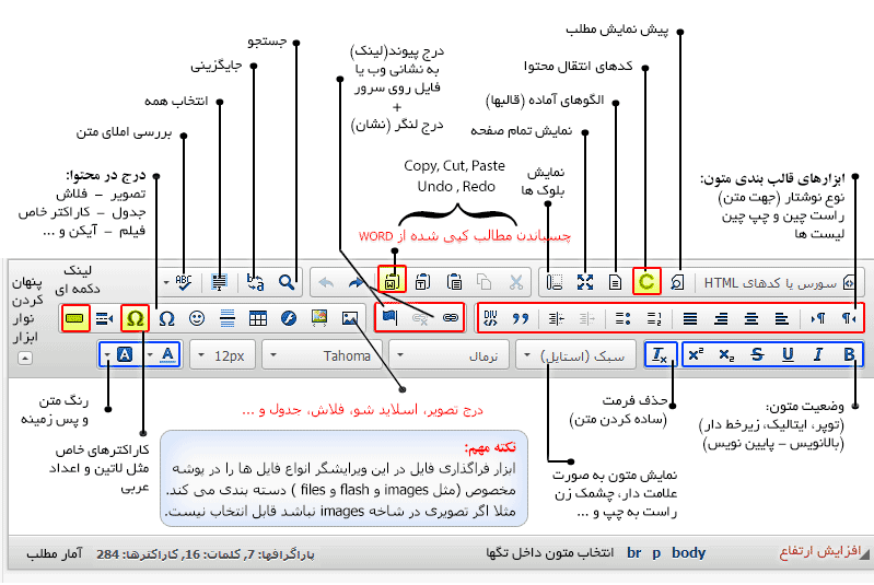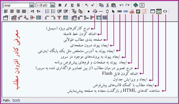 آشنایی با دکمههای اصلی ابزار htmlarea (ویرایشگر قدیمی برنامه)