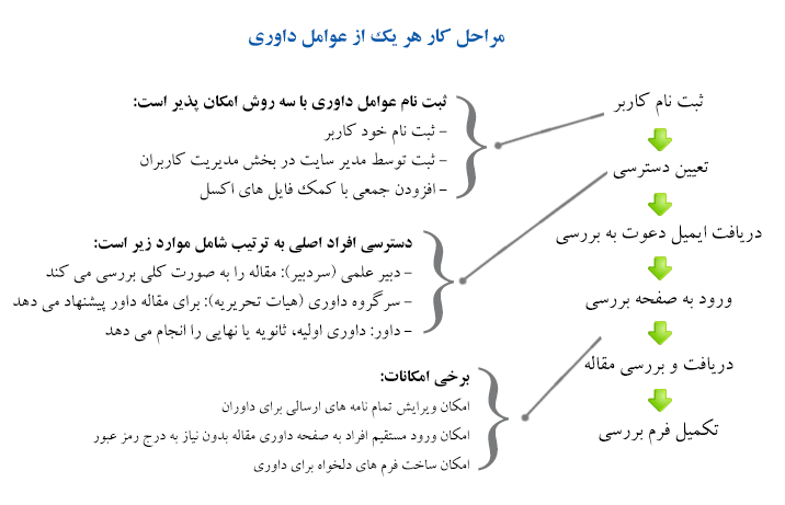 - کلیه مراحل اختیاری هستند و می توان از همه مراحل استفاده نکرد. مثلا مدیر می تواند مقاله را در هر مرحله قبول یا رد کند. امکان تنظیم مراحل فعال مورد نظر از طریق بخش تنظیمات داوری وجود دارد.