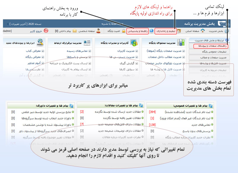 برای شروع کار در بخش مدیریت بخش های زیر را مشاهده کرده و تنظیمات موجود را بازبینی و تایید کنید.