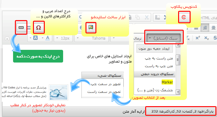 ویرایشگر جدید علاوه بر ابزارهای معمول برای درج تصاویر، لینک ها، و تصاویر و نیز فرمت بندی متون، به ابزارهای ویژه ای برای تسهیل کار مدیران پایگاه مجهز شده است. برخی از امکانات ویژه ویراشگر جدید برنامه عبارتند از: